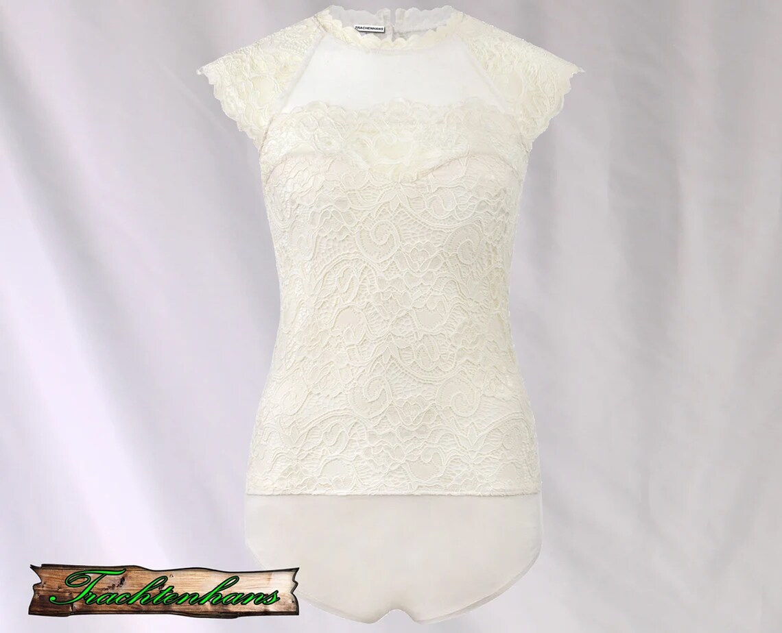 Dieser hochgeschlossene Trachtenbody aus hochwertigem, dehnbarem Spitzenstoff besticht durch das edle Stickerei-Design. Im Vorderteil ist der Body blickdicht in Miederform gearbeitet, dies schafft zusammen mit dem Organza Besatz ein hübsches Dekolleté. Voll im Trend sind die verspielten Flügelärmel mit Spitzenbesatz.