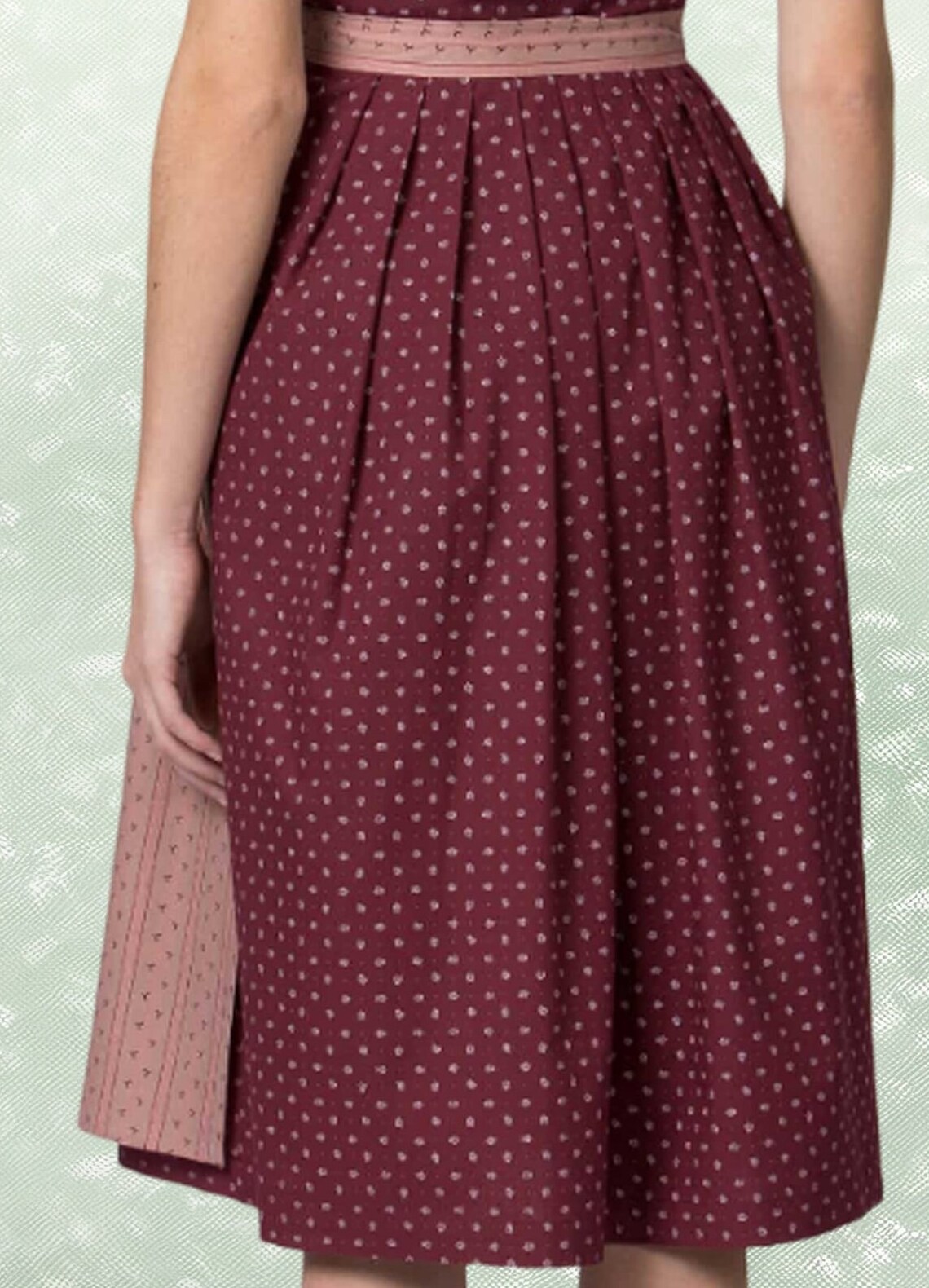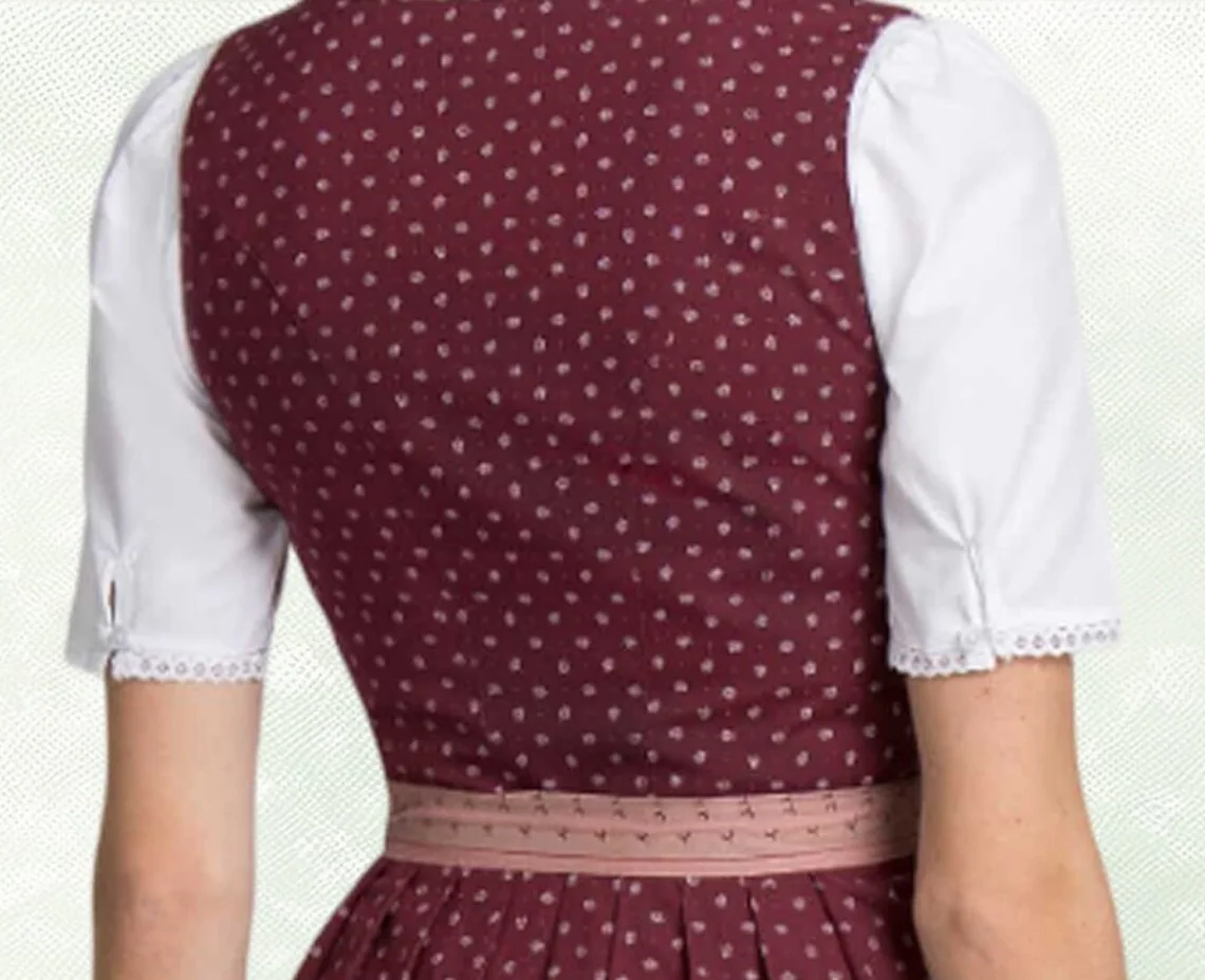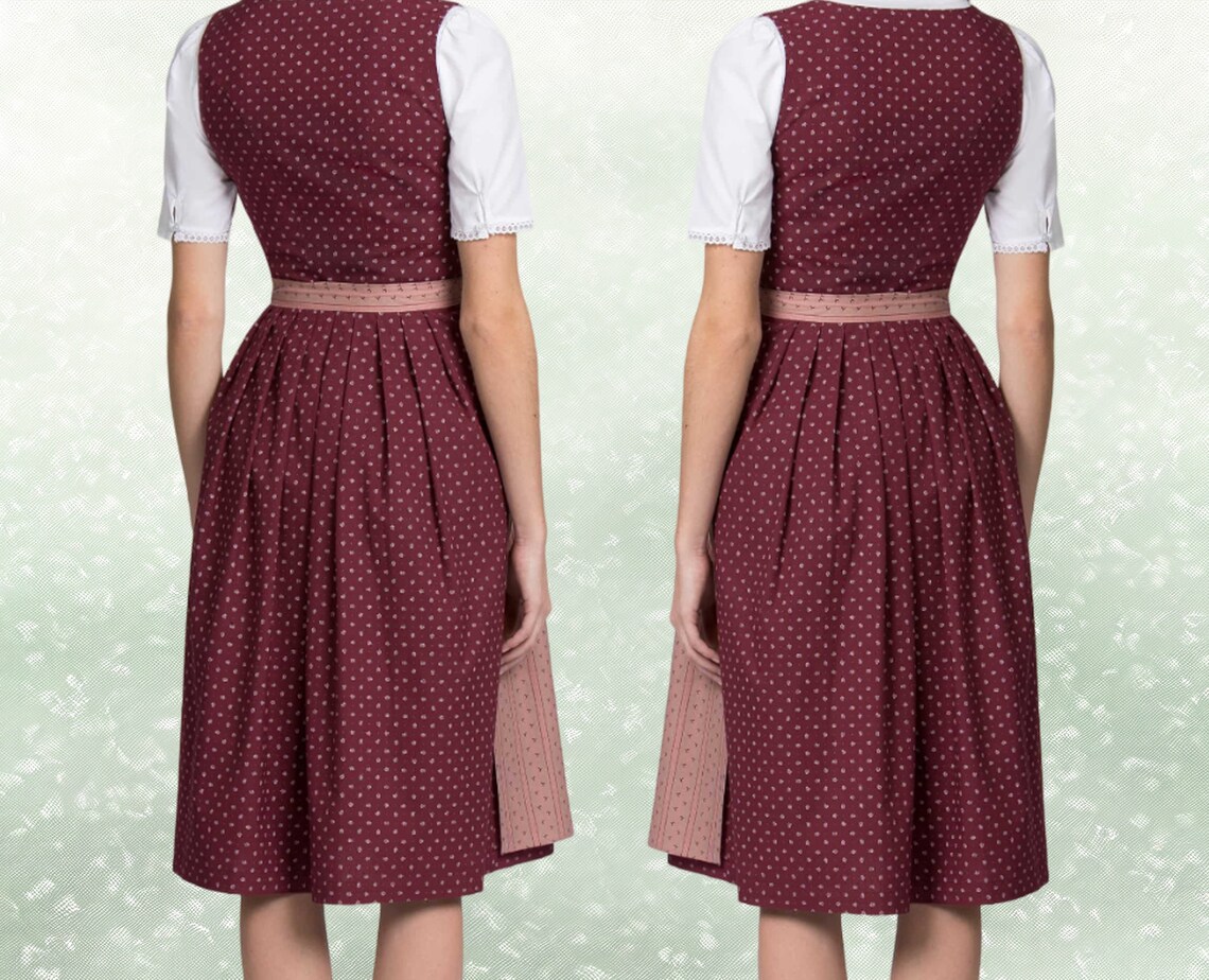 Dirndl bordeaux begeistert durch den hochgeschlossenen Schnitt und ist mit liebevollen Details versehen. Klassisch zurückhaltend und trotzdem edel, so verzaubert das Dirndl mit pflegeleichter Baumwolle in floralem Allover.