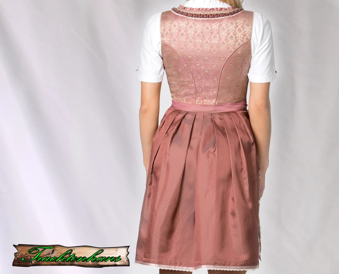 Das stilvolle Dirndl verzaubert mit dem taupefarbigen Jacquard Stoff und der passenden Spitzenschürze. Edle Stoffe, beste Verarbeitung und der perfekte Schnitt machen dieses exklusive Modell zu deinem ganz persönlichen Schmuckstück. Für die feminine Note sorgen die eingearbeiteten Rüschen am Ausschnitt und die aufgenähten Zierborten. Die Miederhaken sind in altsilber und mit edlen Strasssteinen verziert. Das kontrastfarbige Schürzenband in den passend abgestimmten Farben prägt den unverwechselbaren Stil.