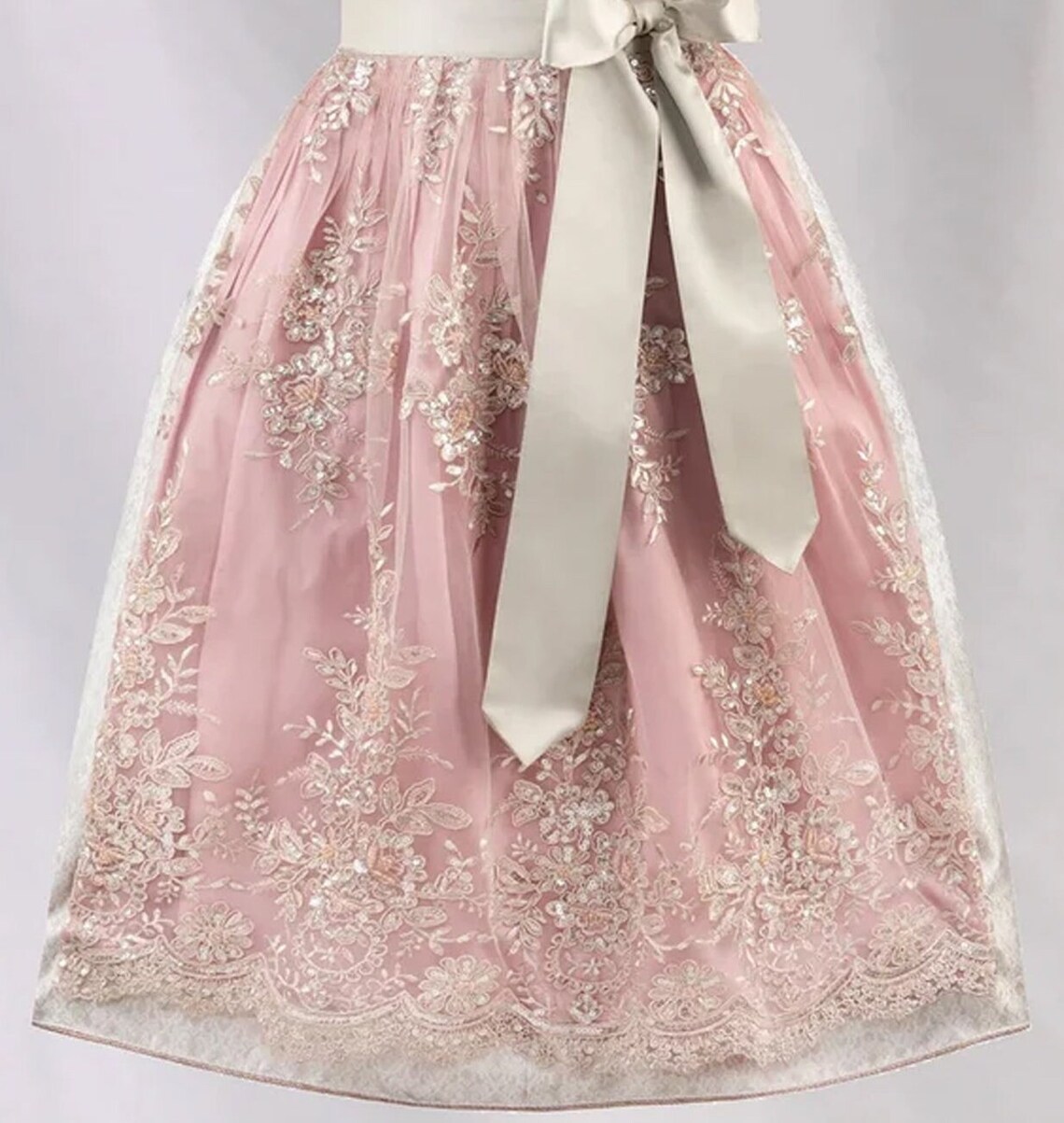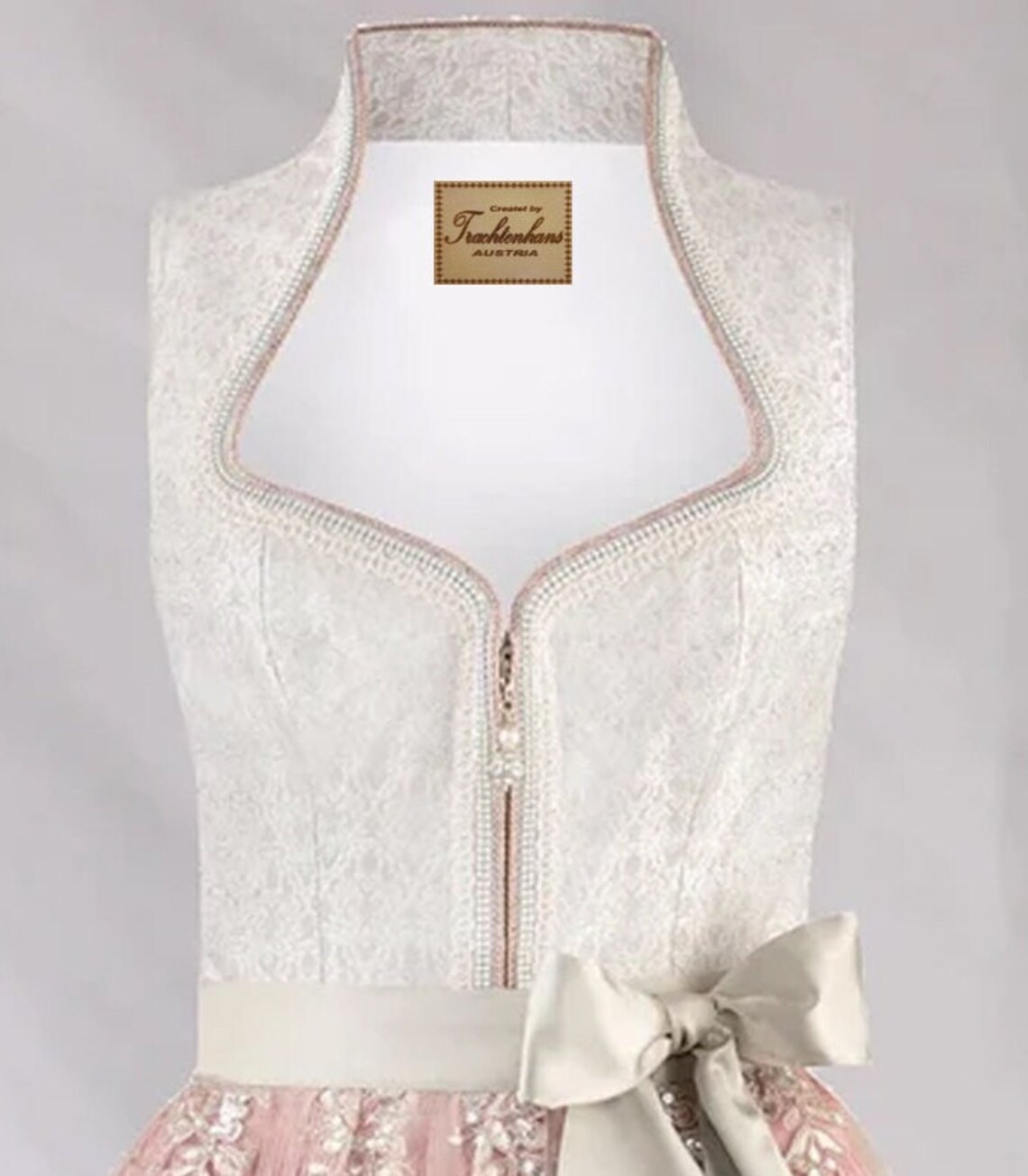 Die Oberteile der Dirndln sind zum teil kunstvoll bestickt mit Motiven aus der Natur: Blumen, Vögel und Berggipfel. Der Rock fällt in weichen Falten und ist teilweise verziert mit Borten, die an die Bergbäche erinnerten. Jedes Dirndl erzählt eine Geschichte von der Schönheit und der Stärke der Berge.
