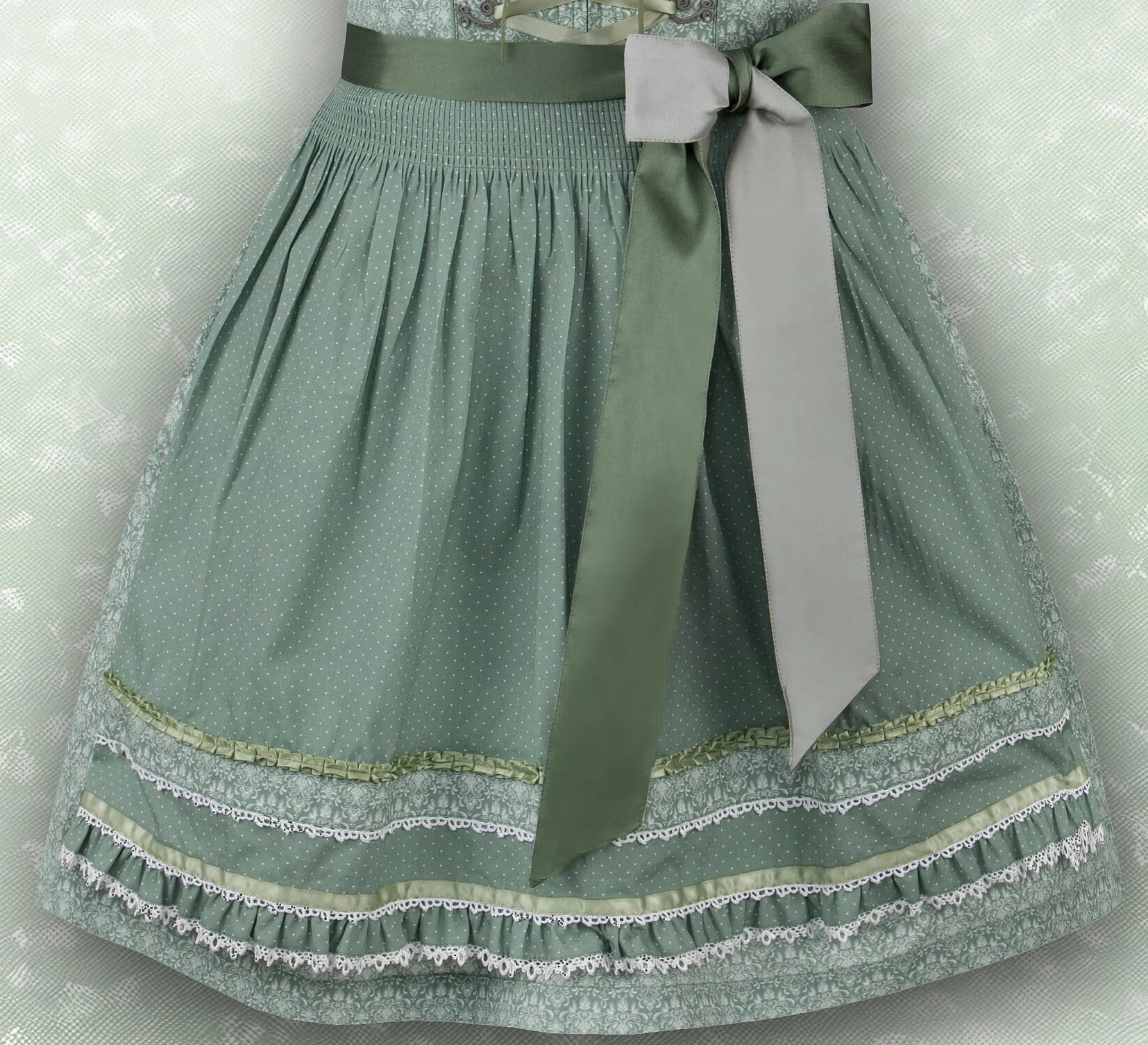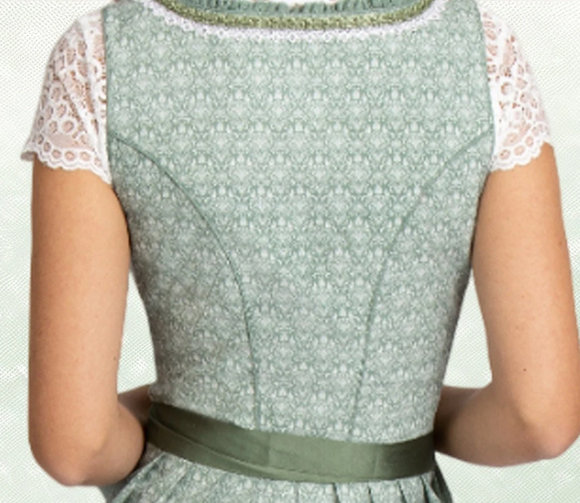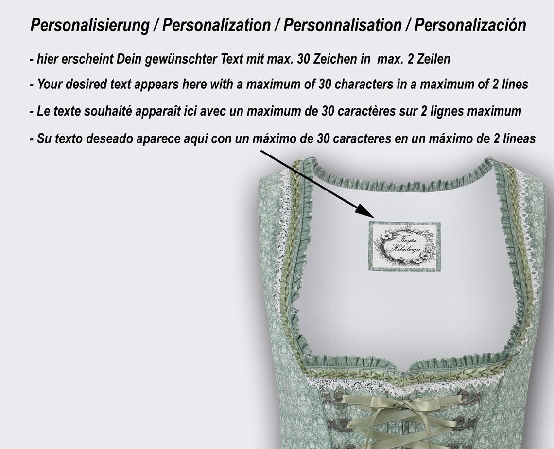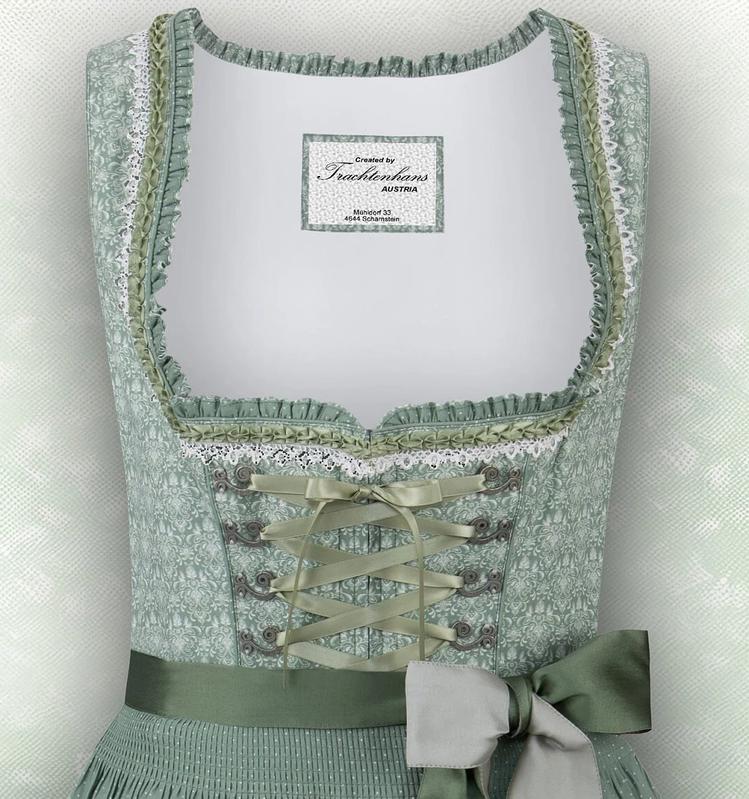 Der trendige Trachten-Look wird durch die Schnürung mit farbigem Satinband perfektioniert, die das elegante Design unterstreicht und dem Dirndl eine individuelle Note verleiht. Die hochwertige, farblich abgestimmte Schürze mit Zierborten rundet das Gesamtbild gekonnt ab und verleiht dem Outfit eine zusätzliche Eleganz.