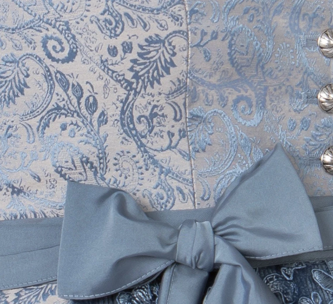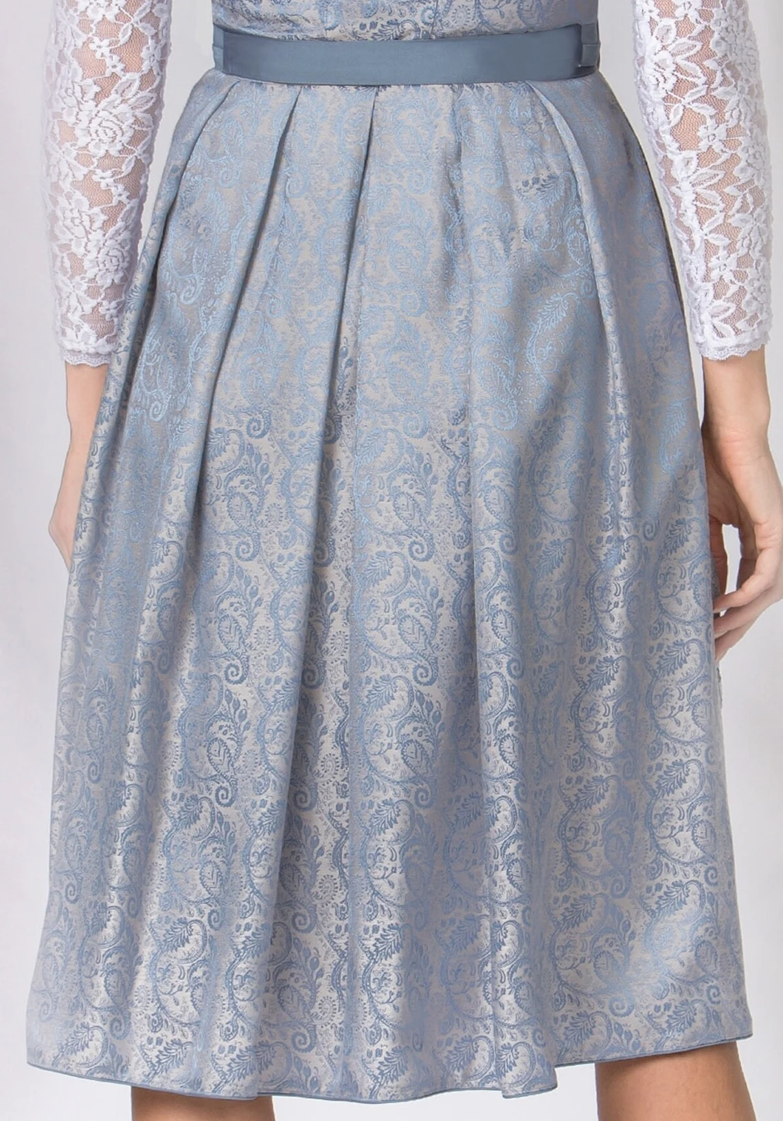Das exklusive Modell begeistert durch den trendigen Trachtenstoff und besticht durch die schlichte Elegance. Für die feminine Note sorgt der trendige Schalkragen mit Rundausschnitt und schafft ein traumhaftes Dekolleté. Der in Falten gelegte Rock mit einer Schubtasche fällt elegant und wird durch die farblich abgestimmte Spitzenschürze perfekt abgerundet. Ein absolutes Lieblingsstück für die moderne Braut.