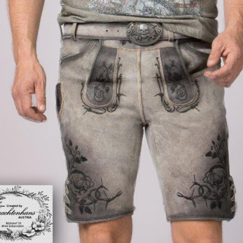 Die kurze Lederhose aus hochwertig gegerbten Wildbock Leder in Hirschoptik zeichnet sich durch den ausgefallenen Antik-Look aus und gehört zu unseren Lieblingsstücken. Die stylische Stickerei mit angesagtem „Crowhead-Motiv und klassischen Hopfenranken“ ist markant und zieht jede Menge Blicke auf sich. Den Innenbund ziert die Stickerei „Götterrabe“ die das Trendlabel prägt. Die außergewöhnliche Strukturierung des Leders mit antiken Farbverläufen verleiht dem Modell eine einzigartige Note und macht sie zu etwas ganz Besonderem. Die Lederhose wird mit einem passenden, hochwertigen Ledergürtel und der unverkennbaren Schließe von „Mountain Rocker“ geliefert.