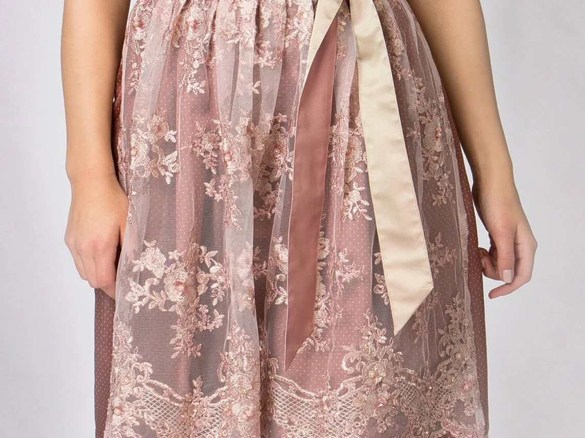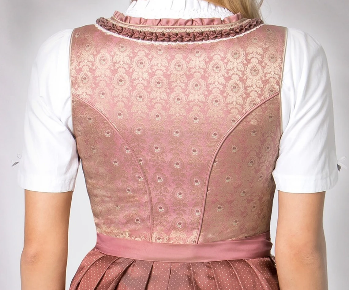 Das stilvolle Dirndl verzaubert mit dem taupefarbigen Jacquard Stoff und der passenden Spitzenschürze. Edle Stoffe, beste Verarbeitung und der perfekte Schnitt machen dieses exklusive Modell zu deinem ganz persönlichen Schmuckstück. Für die feminine Note sorgen die eingearbeiteten Rüschen am Ausschnitt und die aufgenähten Zierborten. Die Miederhaken sind in altsilber und mit edlen Strasssteinen verziert. Das kontrastfarbige Schürzenband in den passend abgestimmten Farben prägt den unverwechselbaren Stil.