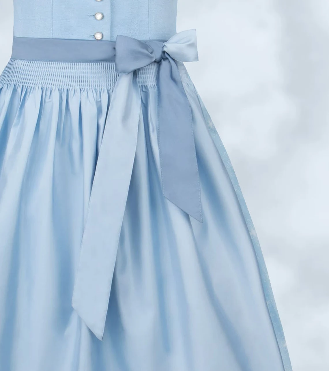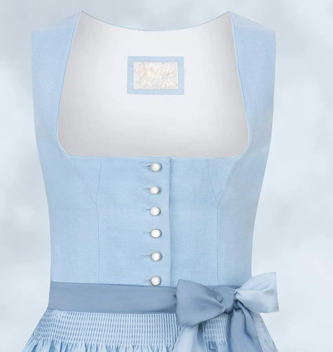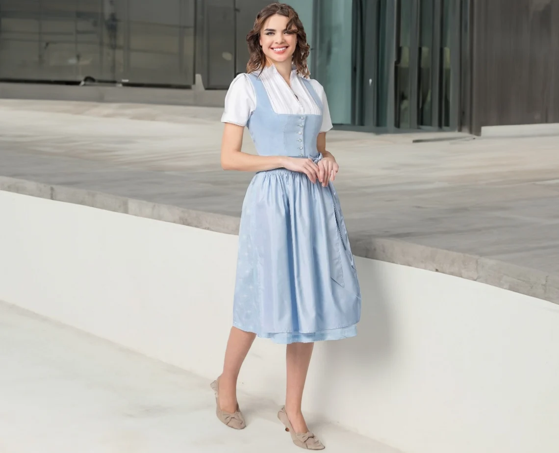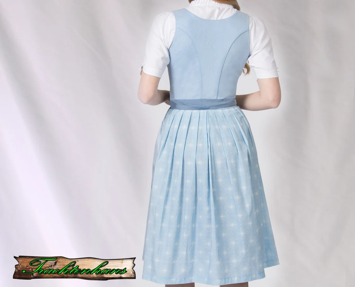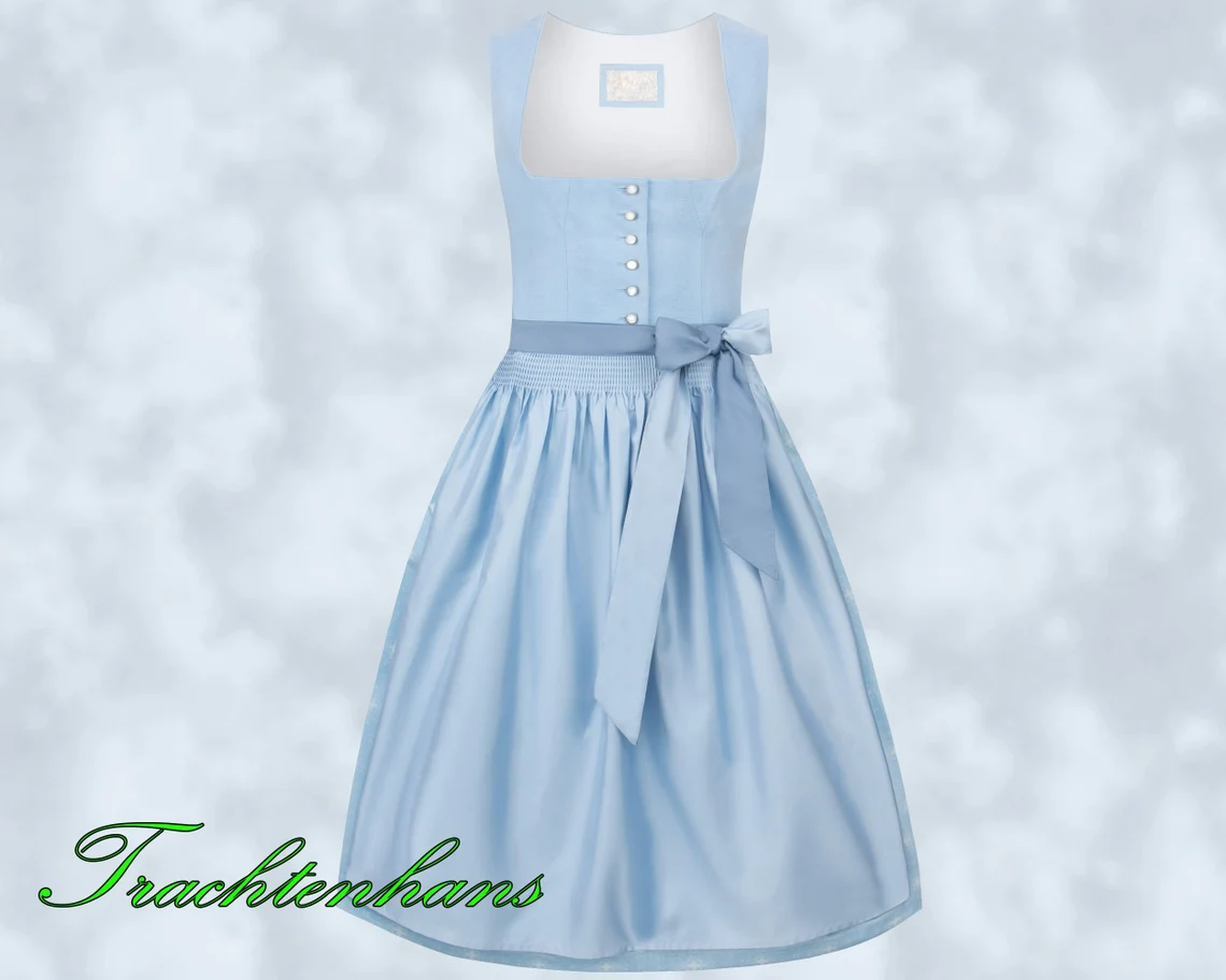 Trachtenhans präsentiert stolz das Dirndl in einem strahlenden Hellblau. Dieses exklusive Modell garantiert einen unvergesslichen Auftritt. Das Mieder dieses sommerlichen Dirndls besteht aus hochwertigem Leinenstoff und wurde im traditionellen Münchner Schnitt gefertigt, was perfekt zu seinem zeitlosen Charme passt. Die edlen Perlmutt-Knöpfe verleihen dem Trachten-Look eine besondere Note. Der pflegeleichte, bedruckte Baumwollrock und die farblich abgestimmte Schürze komplettieren dieses meisterhaft gestaltete traditionelle Ensemble.