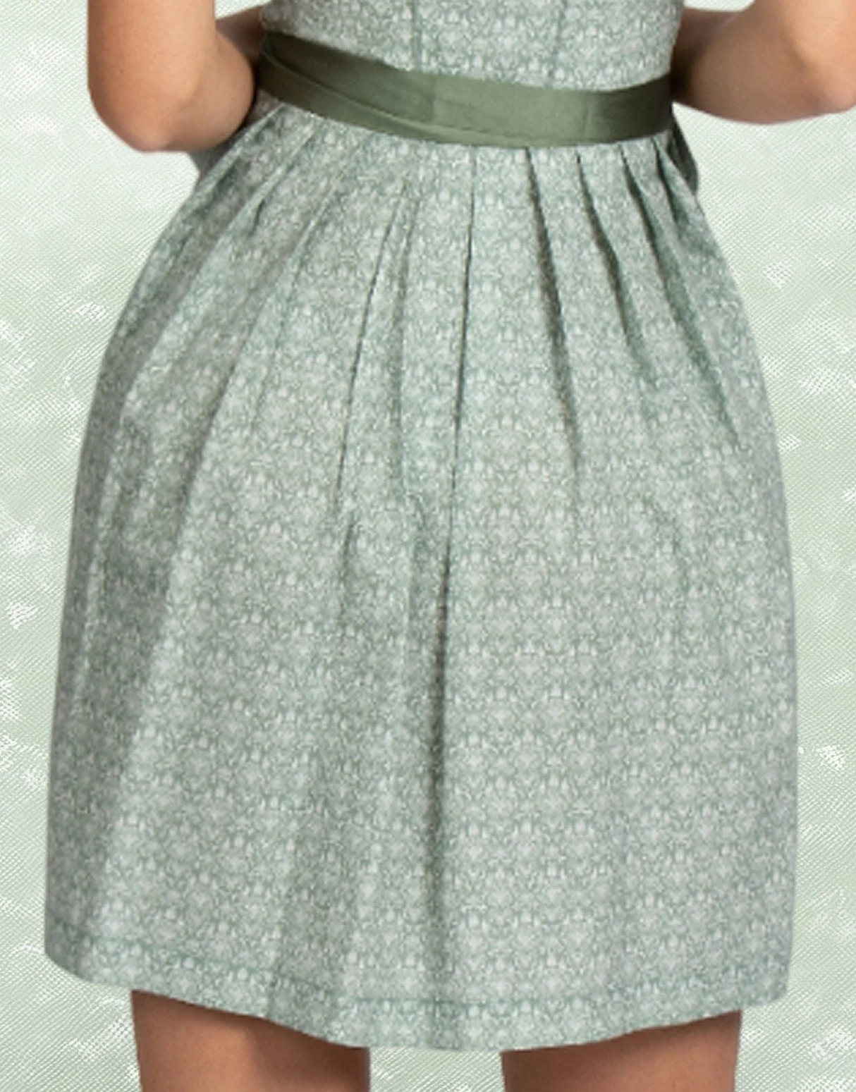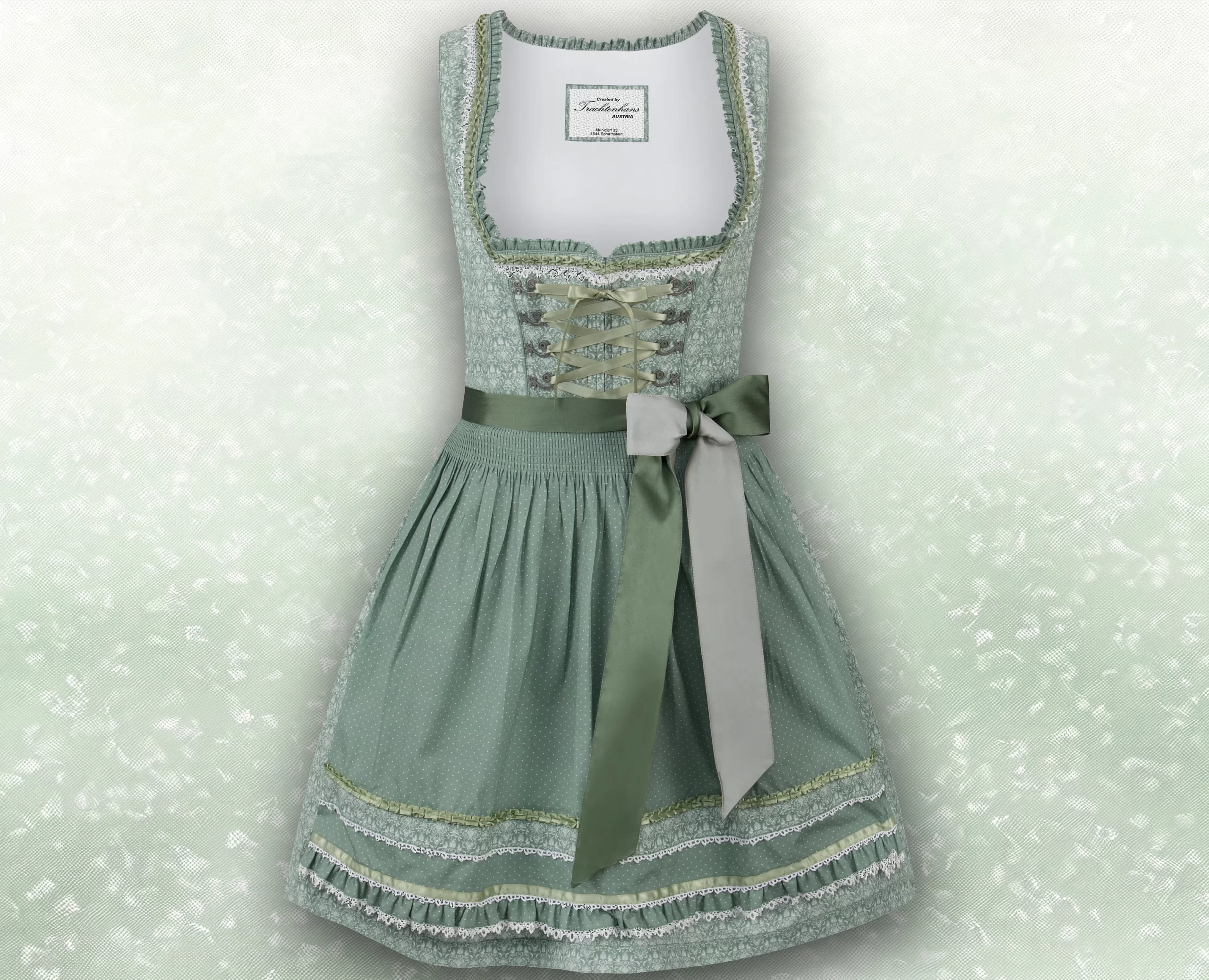 Der trendige Trachten-Look wird durch die Schnürung mit farbigem Satinband perfektioniert, die das elegante Design unterstreicht und dem Dirndl eine individuelle Note verleiht. Die hochwertige, farblich abgestimmte Schürze mit Zierborten rundet das Gesamtbild gekonnt ab und verleiht dem Outfit eine zusätzliche Eleganz.