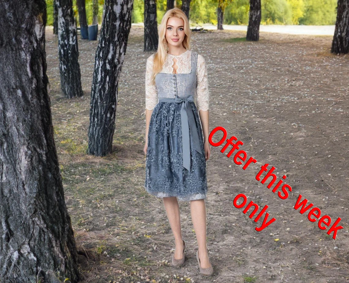 Das exklusive Modell begeistert durch den trendigen Trachtenstoff und besticht durch die schlichte Elegance. Für die feminine Note sorgt der trendige Schalkragen mit Rundausschnitt und schafft ein traumhaftes Dekolleté. Der in Falten gelegte Rock mit einer Schubtasche fällt elegant und wird durch die farblich abgestimmte Spitzenschürze perfekt abgerundet. Ein absolutes Lieblingsstück für die moderne Braut.