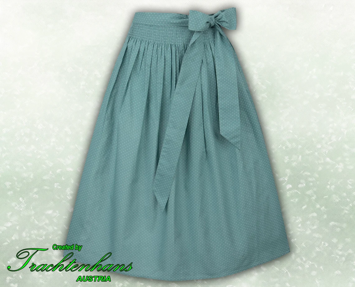 Die gestiftelte Schürze aus pflegeleichter, bedruckter Baumwolle ist mit einem traditionellen Tupfenmuster versehen, das einen charmanten und zeitlosen Look verleiht. Mit einer Gesamtlänge von 70 cm bietet sie nicht nur Stil, sondern auch Schutz und Komfort